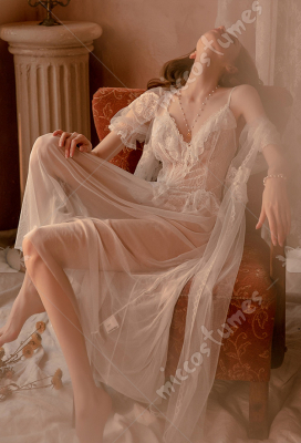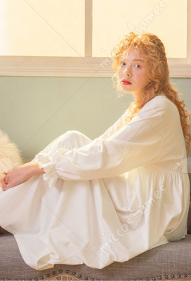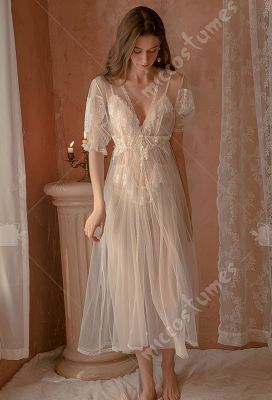 Women V-Neck Vintage Buttons Design Loose Nightgown Long Sleeve Bubble Sleeve Dress Night Wear Loungewear Costume Outfit