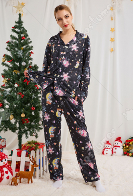 Christmas Women Adults Moon Night and JK Santa Claus Pattern Long Sleeve Plain-Weave Pajamas Set Sleepwear Lounge Sets with Pants Costume 2 Piece Outfits