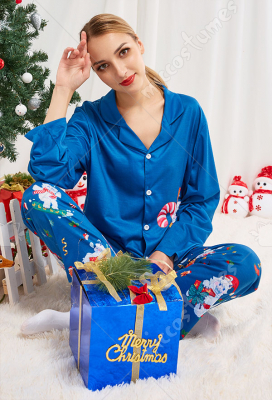 Christmas Women Adults Cartoon Sitting and Bathing Santa Claus Pattern Long Sleeve Plain-Weave Pajamas Set Sleepwear Lounge Sets with Pants Costume 2 Piece Outfits