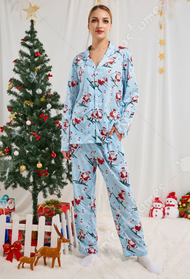 Christmas Women Adults Cartoon Singing and Sledding Santa Claus Pattern Long Sleeve Plain-Weave Pajamas Set Sleepwear Lounge Sets with Pants Costume 2 Piece Outfits