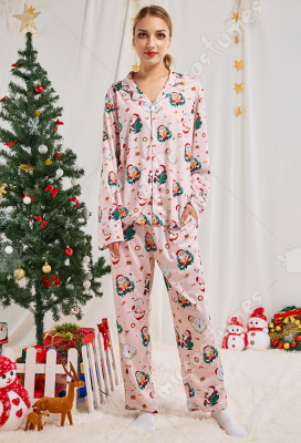 Christmas Women Adults Cartoon Sledding Santa Claus Pattern Long Sleeve Plain-Weave Pajamas Set Sleepwear Lounge Sets with Pants Costume 2 Piece Outfits
