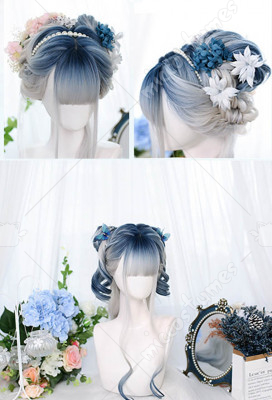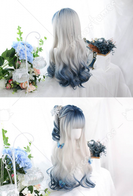 Halloween Lolita Gradient Cosplay Wig Harajuku White and Blue Highlight Mixed Color Long Wavy Curly Wig