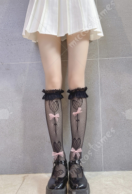 Women Bowknot Lace Knee-High Socks Japanese Style Hollow-Out Net Knee Socks 2 Pairs