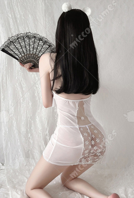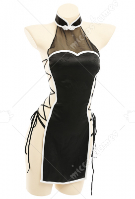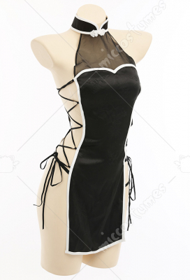 Women Sexy Style Strapped Net Halter Cheongsam Uniform Bodysuit with Silk Cape