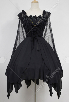 Dark Gothic Cute Lace Ruffle Hem Irregular Dress with Detachable Cape