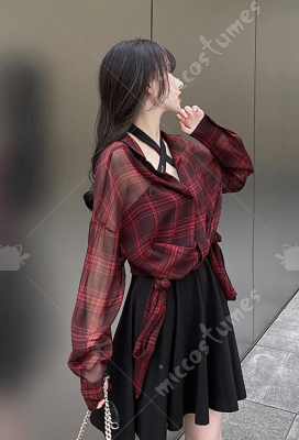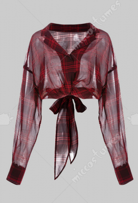 Punk Dark Style Women Tie Hem T Shirt Long Sleeve V Collar Shirt Blouse Sheer Chiffon Plaid Coat Crop Top