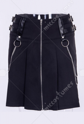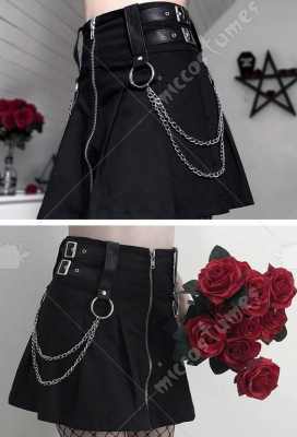 Girls Gothic Punk Dark Style Black A Line Pleated Skirt Women Front Zip Up Mini Short Skirt with Metal Chain Decoration