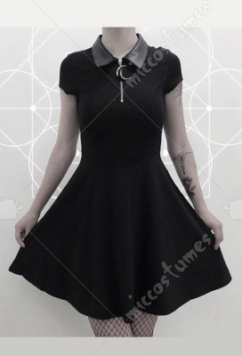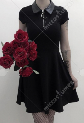 Girls Gothic Dark Style Punk Black Short Sleeves Women Mid Length Shirt Dress with Crescent Moon Zipper Adjustment