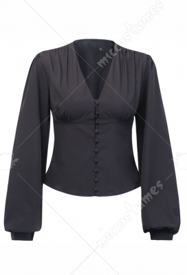 Girls Gothic Punk Dark Style Women Black Long Lantern Sleeves Single Breasted Waist Pattern Deep V Shape Collar Shirt Blouse Top