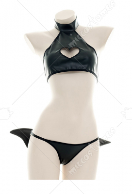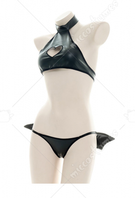 Faux Leather Backless Chest Open Hollow Heart Sleepwear Japanese Style Turtle Neck Backless Sexy Homewear Lingerie Set Halter Neck Top G String Briefs with Wings