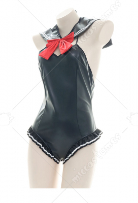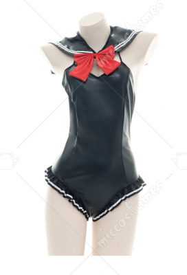 Faux Leather Bodysuit Backless Chest Open One Piece Swimwear Japanese Style Sailor Collar Bowknot Ruffled Swimsuit Halter Neck Sexy Lingerie Homewear Sleepwear Bathing Suit