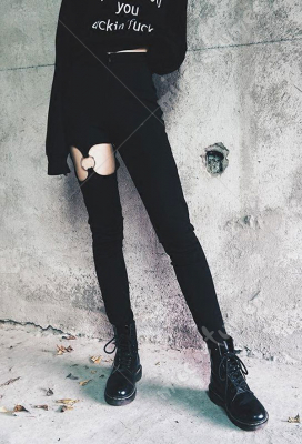 Woman Gothic Cool Dark Style Zipper-Worn Metal Ring Decorated Ripped Trousers Torn Pants Costume Outfit