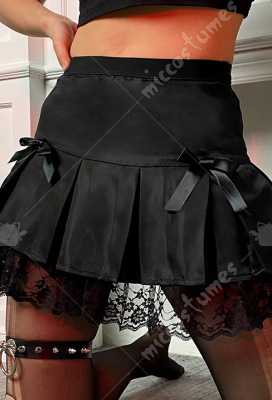 Woman Gothic Cool Dark Style Lace Decorated Spliced Pleated Skirt Cosplay Outfit for Autumn Winter with Bow Decorations