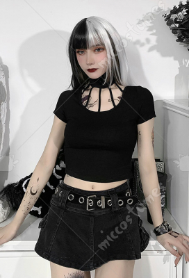 Woman Gothic Dark Style Cool Hollow Type Halter Navel Short Sleeved T-Shirt Top Costume Outfit for Spring Summer