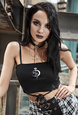 Woman Gothic Cool Dark Style Rose and Moonlight Pattern Tie-Front Backless Lingerie Vest Top Costume Outfit