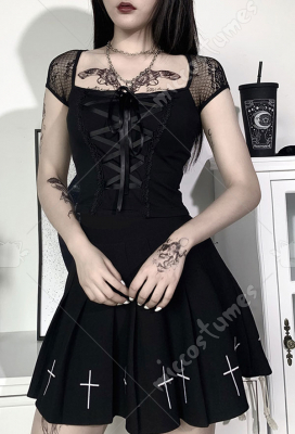 Woman Gothic Cool Dark Style Skellington Pattern Bow Decorated Net Yarn Navel Lace Lingerie Vest Top Costume Outfit for Summer