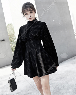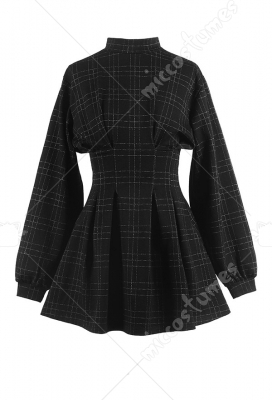 Dark Gothic Women Dress Long Sleeves Plaid A Line Balloon Sleeve Dress for Autumn Winter