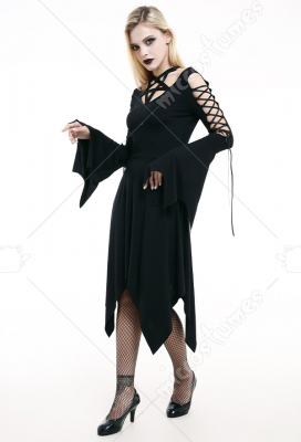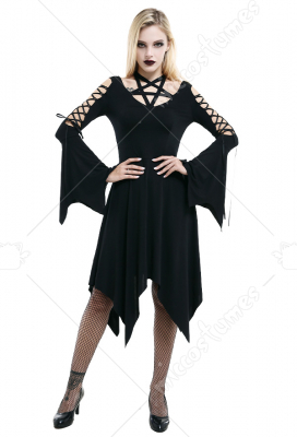 Dark Gothic Punk Witch Style Women Retro Long Lace Up Bell Sleeve Mid Length Dress Chest Pentagram Hollow Elegant Goth Dress Outfit with Irregular Hemline