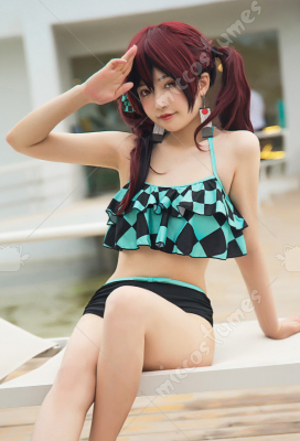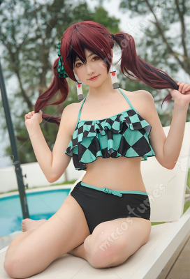 ®Haikyuu KNY Tanjiro Green and Black Grid Pattern Halter Neck Top and High Waist Shorts Cosplay Costume Two Piece Swimsuit Set Swimwear Bathing Suit