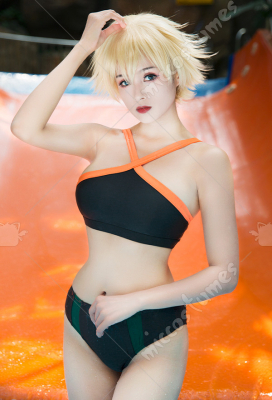 ®Haikyuu My Hero Academia MHA Bakugo Katsuki Kacchan Black Hero Costume Battle Suit Dereviated Halter Spliced Bikini Split Swimsuit Swimming Pants Swimwear Bodysuit Bathing Suit Outfit Cosplay Costume