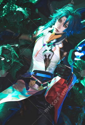 Genshin Impact Xiao Seal Gem Decorated Uniform Set Cosplay Costume Outfit with Shoulder Armors Gloves Sleeves
