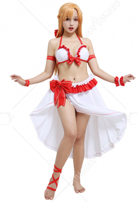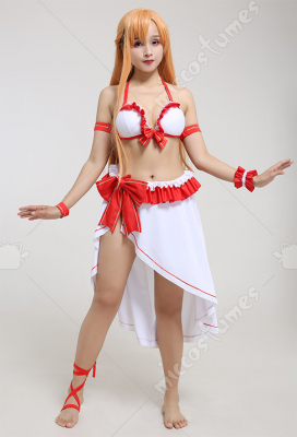 ®Haikyuu Sword Art Online SAO Yuki Asuna Halter Bow Decorated Bikini Set Top and Shorts Cosplay Costume Outfits with Ruffled Cover Skirt Wristbands Arm Accessories Leg Straps Waist Bow Accessory Headdress