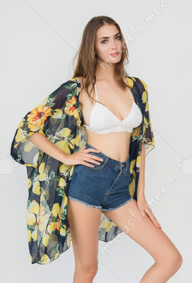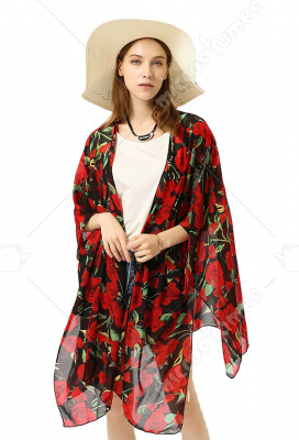 Woman Elegant Floral Pattern Chiffon Sun Protection Beach Kimono Swimwear Shirt Dress Cover Up Outfit Accessory for Spring Summer