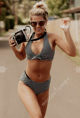 Woman Cute Sexy Fine Grid Pattern Two-Piece Split Bikini Set Swimsuit Swimming Pants Swimwear Bodysuit Bathing Suit Outfit for Hot Spring and Pool