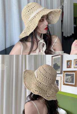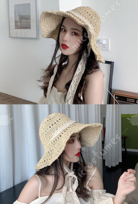 Woman Elegant Sun Protection Lace Strap Decorated Tie-Front Weave Wide Brim Straw Hat Vacation Wear Hat Outfit Accessory for Spring Summer