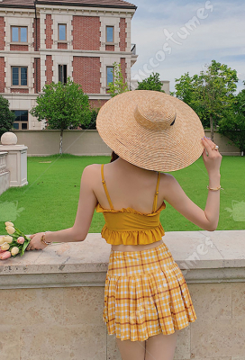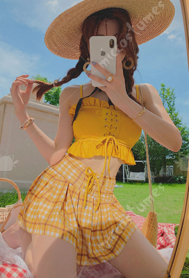 Woman Japanese Style Cute Sexy Lace Strapped Pattern Two-Piece Swimwear Lingerie and Plaid Pattern Skirt Swimsuit Swimming Suit Swimwear Bodysuit Bathing Suit Outfit for Hot Spring and Pool