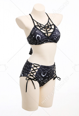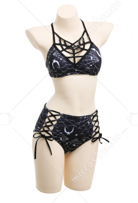 Woman Gothic Spidernet Bat Pattern Spaghetti Straps Lace Up Two Pieces Bikini Set Swimming Suit Bathing Suit Beach Swimsuit Outfit Cosplay Costume