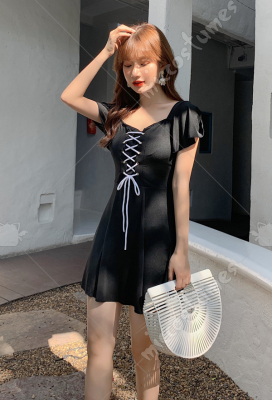 Woman Sexy Cute One Piece Short Puff Sleeved Crossing Laced Low Collar Dress Swimsuit Bodysuit Beach Swimwear Suit Bathing Suit