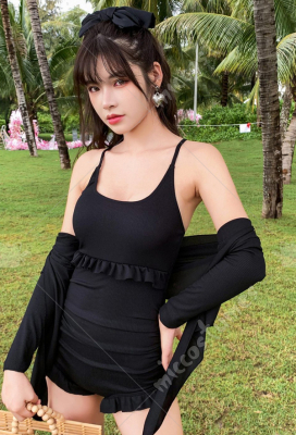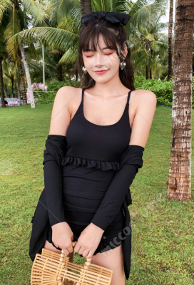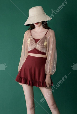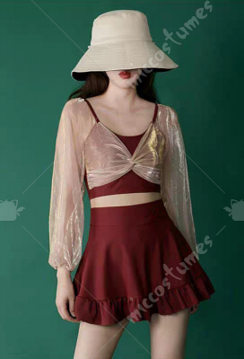 Woman Sexy Cute Bikini Set Two Piece Long Semi-Transparent Sleeved Bow Decorated High Waist Top and Skirt Splited Beach Swimsuit Swimwear Suit Bathing Suit