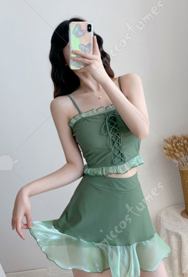 Woman Sexy Cute Lace-Decorated Crossing Strapped Lingerie and Skirt Two Piece Bikini Set Swimsuit Beach Swimwear Suit Bathing Suit