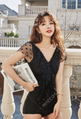 Woman Sexy Cute One Piece Lace-Decorated Strapped Short Sleeved V-Shape Collar Dress Swimwear Bodysuit Beach Suit Bathing Suit