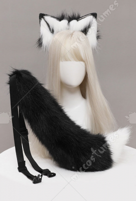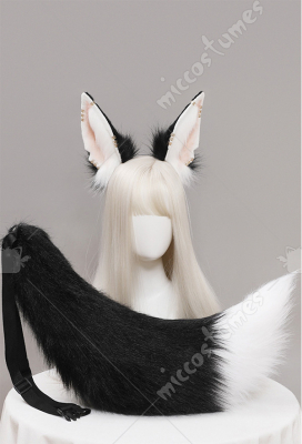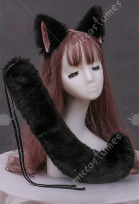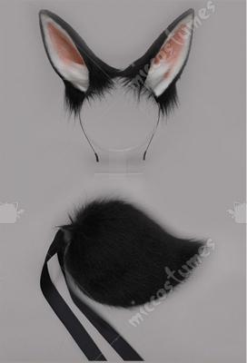 Women Kawaii Lolita Black Furry Anubis Derivative Headwear Handmade Faux Fur KC Headband Animal Cosplay Accessory Headdress Outfit with Tail and Earrings