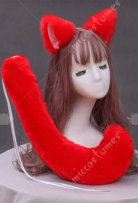 Women Fenrir Kawaii Red and Black Wolf Plush Ears Handmade Faux Fur Hair Clips Animal Cosplay Accessory Headdress Outfit Set with Tail