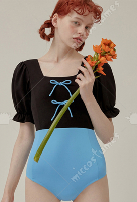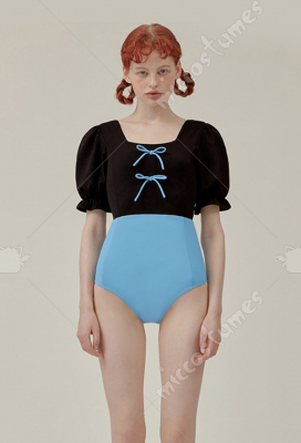 Women Blue Black Color Contrast One Piece Swimsuit High Cut Puff Sleeve Swimwear Beach Wear Back Hollow Square Collar Monokini Bathing Suit with Pads