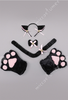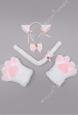 Women Kawaii Pink Bow Decorated Plush Furry Cat Ears Tail Gloves Headwear Set Cosplay Accessory Outfits