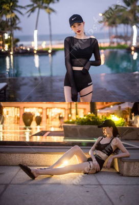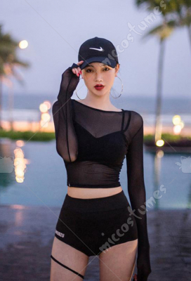 Women Spaghetti Strap Top Long Sleeve Sheer Sun Protective Swimsuit Sexy Two Piece Bikini Swimwear High Waist Fitting Bathing Suit with Pads