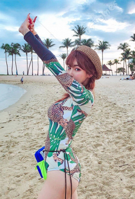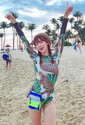 Women Leopard Floral Printed One Piece Swimsuit Long Sleeve Sun Protective Swimwear Sexy Turtleneck Beach Wear Monokini Bathing Suit