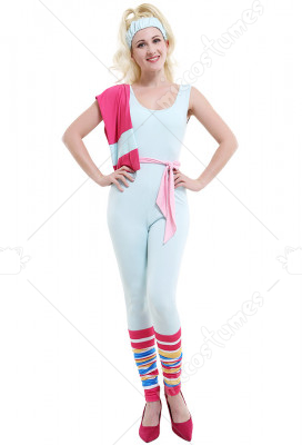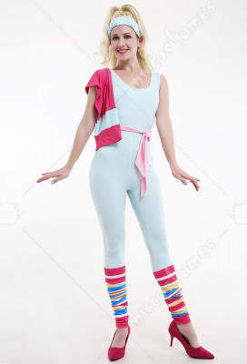 Barbie Doll 90s Milk Silk Zentai Sportsuit Gym Jumpsuit Bodysuit Cosplay Costume with Head Wrap and Belt