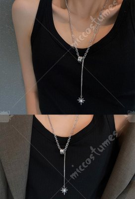 Punk Gothic Dark Style Star Ring Bead Pendant Long Clavicle Chain Sweater Necklace Metal Collarbone Chain Neck Accessory