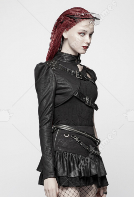 Punk Rave Gothic Floral Pattern One-Arm Short Coat Costume Outfit with Double Crossbody Belt Decorations