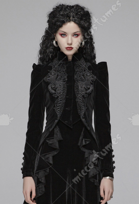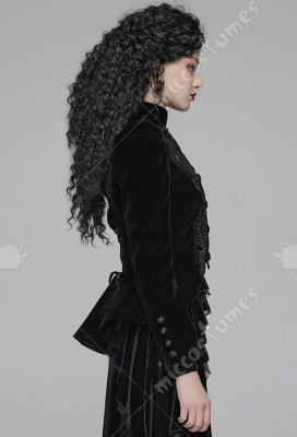 Punk Rave Gothic Fish Tail Cuffed Button and Pearl Decorated Floral Pattern Long Sleeved Weft Velvet Short Coat Costume Outfit with back Crossing Straps
