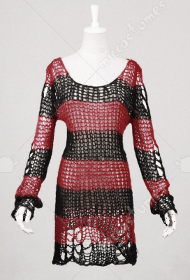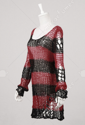 Punk Rave Gothic Red and Black Round Collar Strip Pattern Fishnet Knitting Long Sleeved T-Shirt Outfit Costume