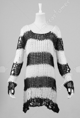 Punk Rave Gothic Black and White Round Collar Strip Pattern Fishnet Knitting Long Sleeved T-Shirt Outfit Costume