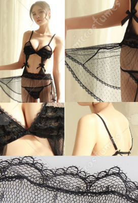 Woman Lace Decorated Net Yarn Transculent Maid Style Dress Set Lingerie Costume Outfit with Headband Wristbands Choker