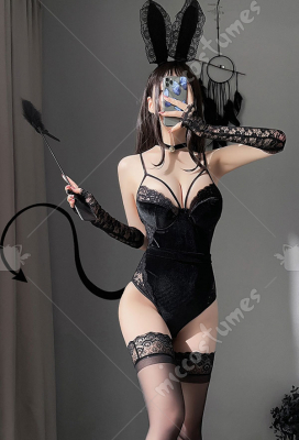 Woman Vintage Lace Decorated Velvet Lingerie Bodysuit Set with Headband Choker Tail