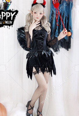 Dark Gothic Lolita Witch Dress Devil Black Irregular Hemline Vampire Bride Cosplay Costume for Halloween with Wings